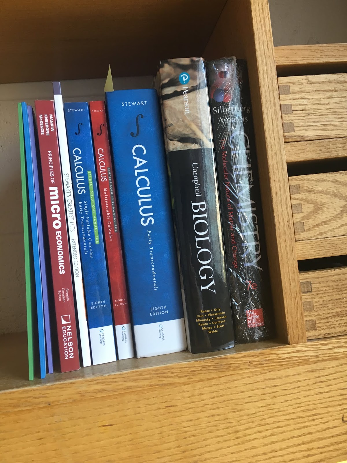 ご参考までに、一年生の1学期目、4科目選択した私の教科書代は、657ドルでした。はい、たかーい!